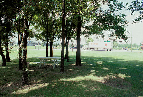 Petit boisé sur le rond-point Papineau aux abords de l'autoroute Métropolitaine et d'un pôle commercial / Wooded site at Papineau loop along the Metropolitan Highway and a commercial pole
